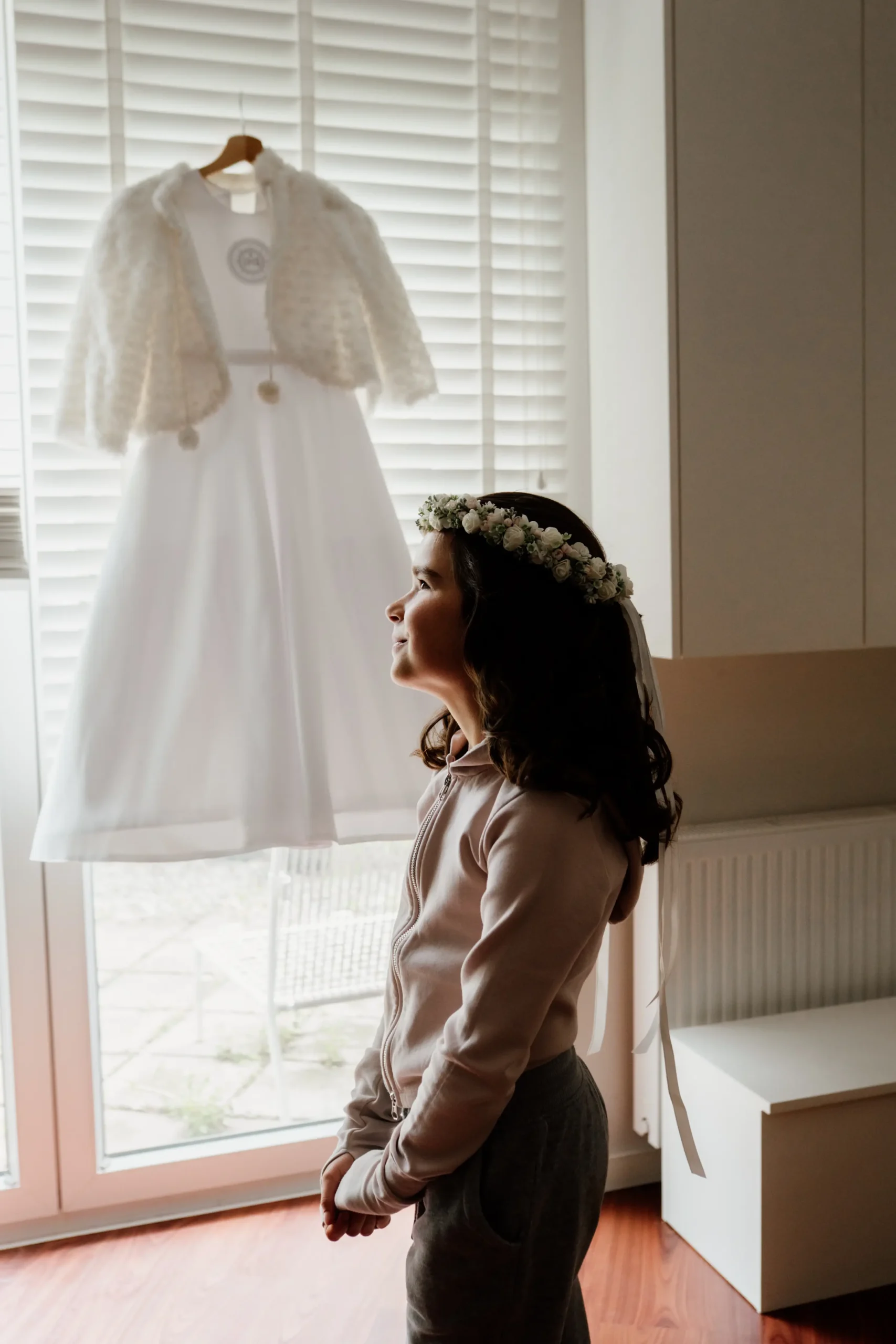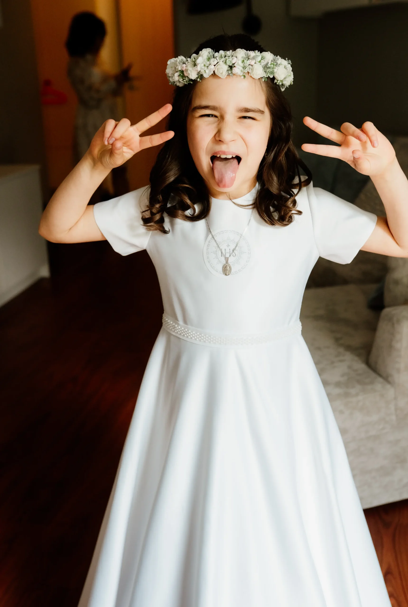 Sesja komunijna może mieć dwie odsłony – bardziej tradycyjną, z książeczką do nabożeństwa i różańcem, lub bardziej swobodną, z ujęciami pełnymi lekkości i radości. Wiem, że dzieci czują się najlepiej w naturalnych kadrach, dlatego często proponuję sesję „na luzie” – wirująca sukienka, alby w ruchu, spontaniczne uśmiechy. Oczywiście, możemy podzielić sesję na dwie części: część w stylizacji komunijnej oraz część bardziej swobodną.